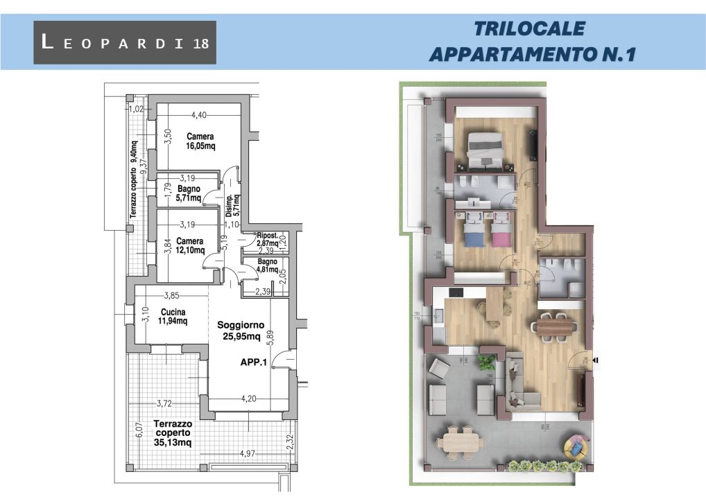 UNITA' 1 - € 310.000 - Appartamento di TRE LOCALI di 107 mq: TRE LOCALI con CUCINA ABITABILE o LIVING OPEN SPACE, DUE BAGNI, RIPOSTIGLIO LAVANDERIA e FAVOLOSA TERRAZZA di 48 mq. Esposizione Est-Sud-Nord.