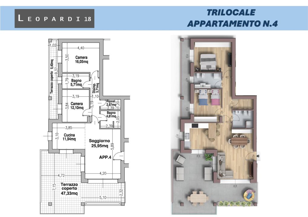 UNITA' 4 - € 320.000 - Appartamento di TRE LOCALI di 107 mq: TRE LOCALI con CUCINA ABITABILE o LIVING OPEN SPACE, DUE BAGNI, RIPOSTIGLIO LAVANDERIA e FAVOLOSA TERRAZZA di 48 mq. Esposizione Est-Sud-Nord.